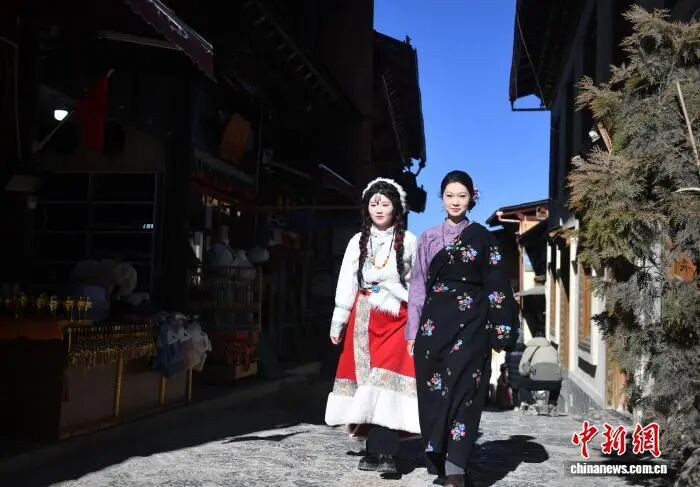 1月22日,两名游客身穿藏族服装游览独克宗古城。 黄兴鸿 摄